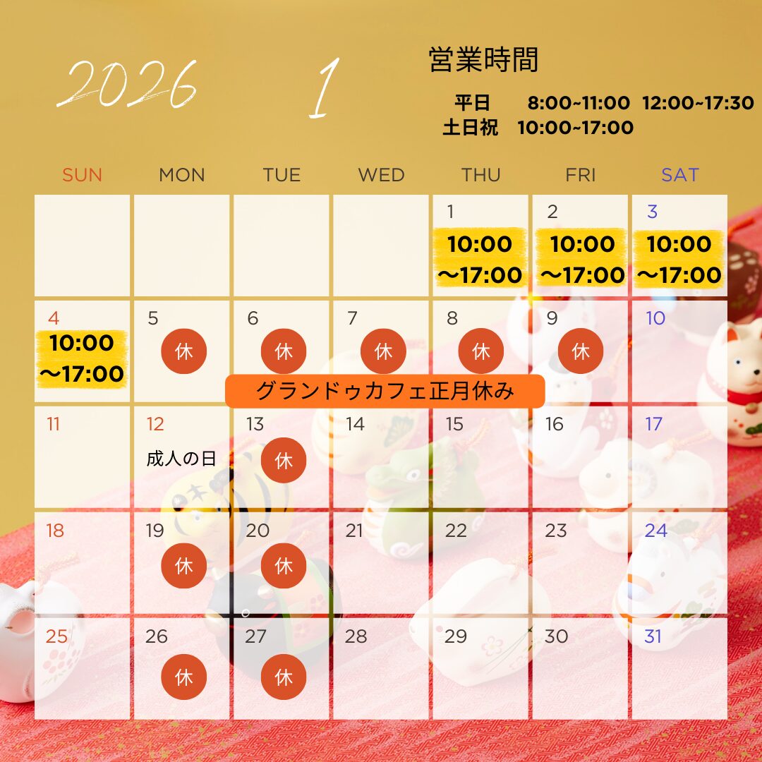 2026年 1月カレンダー 営業日カレンダー 2025.09.162026.01.22 ・1月1日〜1月4日 お正月も10:00〜17:00で営業します☕️ ・1月5日〜1月9日 お正月休みいただきます🎍 ・1月12日(月) 成人の日 祝日営業します㊗️ お正月も営業しますので、初詣のお供に温かいコーヒーいかがですか☕️甘酒ラテも販売予定です♪
